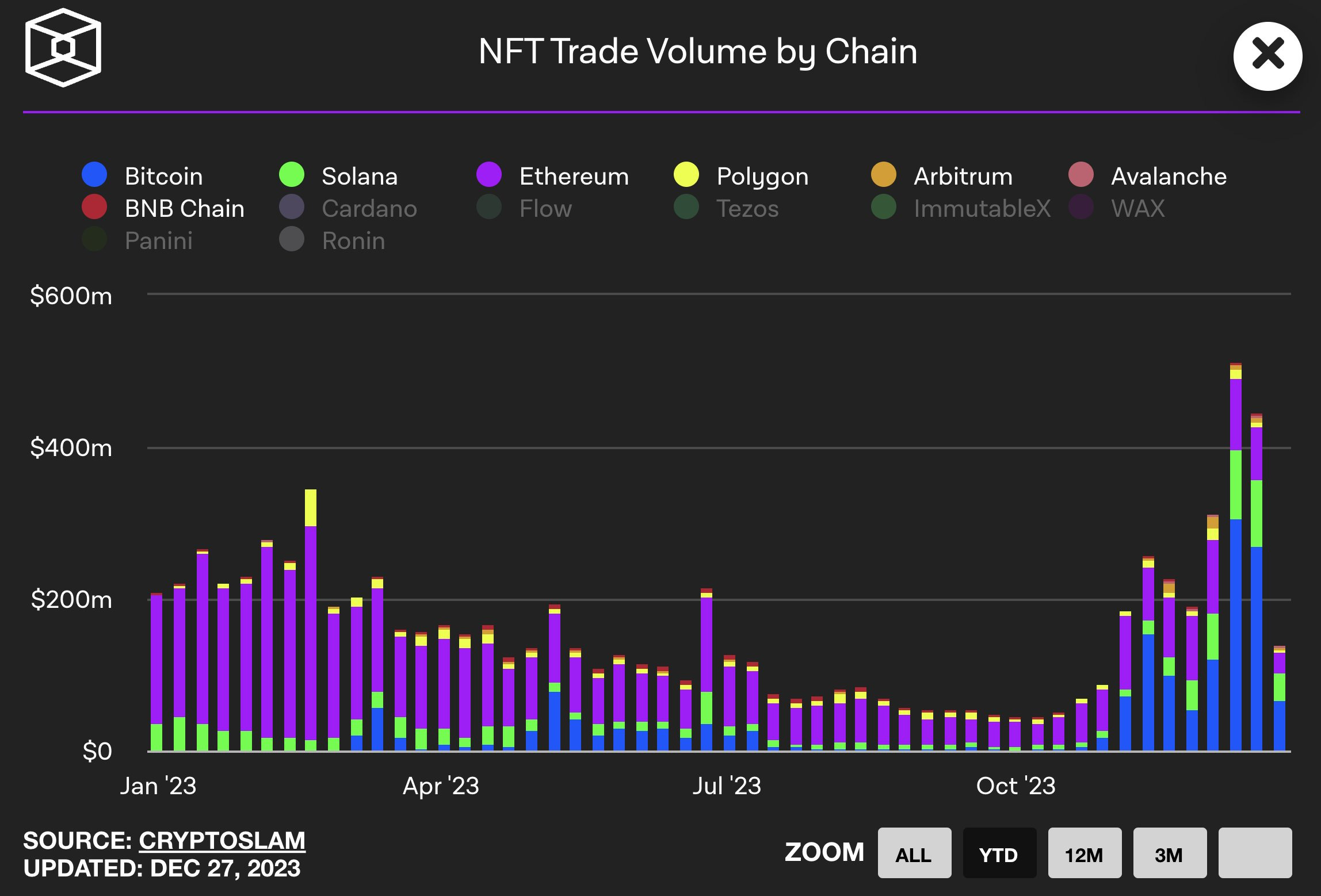 While Ethereum Ethereum has dominated the vast majority of all NFT action for years now, the Bitcoin Bitcoin and Solana Solana NFT scenes joined the NFT party in a big way in 2023.