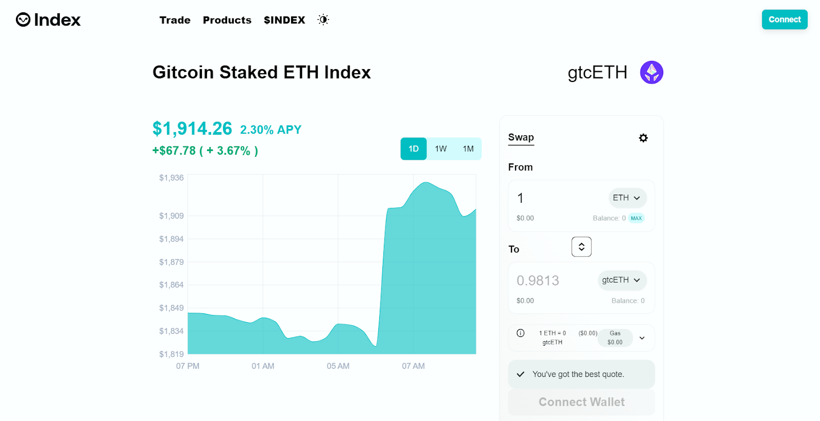 If these benefits are of any interest, you can buy or sell gtcETH on the Index Coop app using the provided swap interface. Right now, 1 ETH fetches 0.9813 gtcETH. Note that gtcETH is not a rebasing token, as staking rewards are designed to be reflected in its increasing price over time.