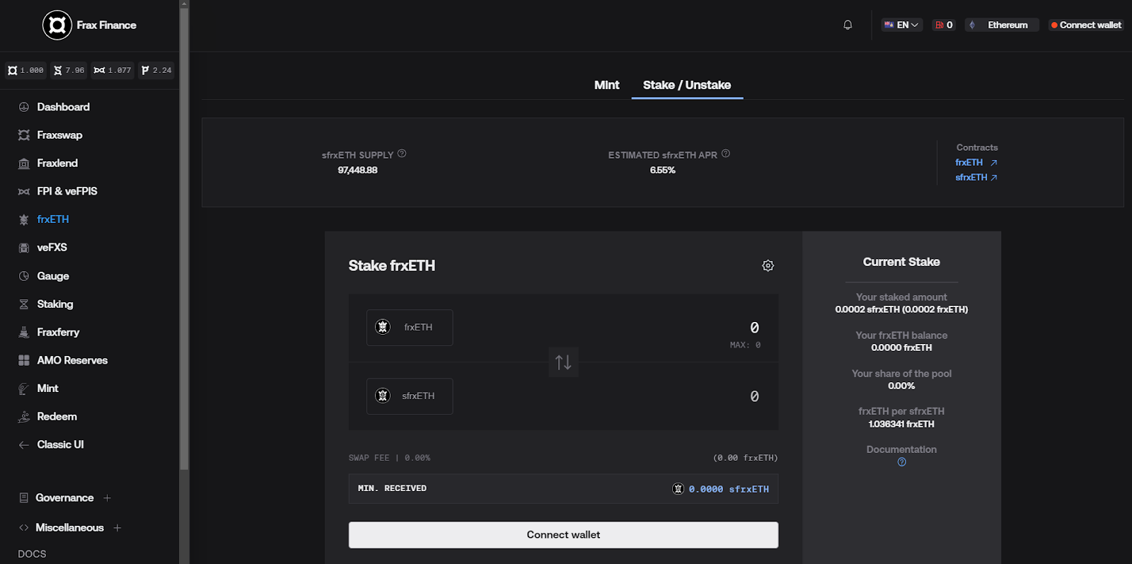 At the moment, sfrxETH is yielding an estimated 6.55% APR, making it the most profitable liquid staking token currently. If you’re interested in staking through Frax, you’d start by minting frxETH from ETH and then swapping frxETH for sfrxETH on the Frax app. 1 frxETH currently fetches you 0.9646 sfrxETH for reference.