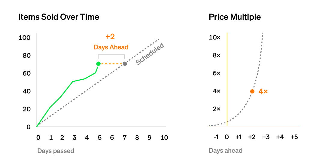 Suppose it is currently day 5, so we should have sold 50 NFTs. However, demand has been high, and we have sold 70. We weren’t supposed to sell 70 NFTs until day 7, so we are two days ahead of schedule.