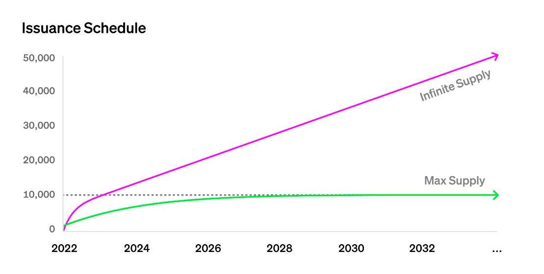 Here, cue in VRGDAs, which are designed to accommodate the issuance of two NFTs — one with a fixed supply, e.g. 10,000, and another with an uncapped supply that is released indefinitely and steadily over time — without having to rely on scheduled auctions.