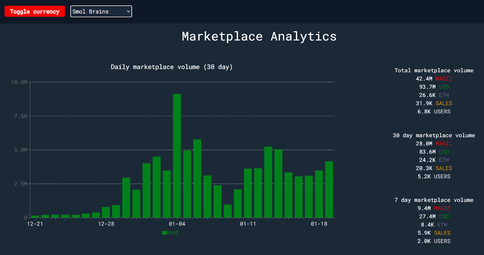 - The platform’s Smol Brains NFTs, which started as a free-to-mint project for Treasure Discord members, are now majorly in demand and have become something of a