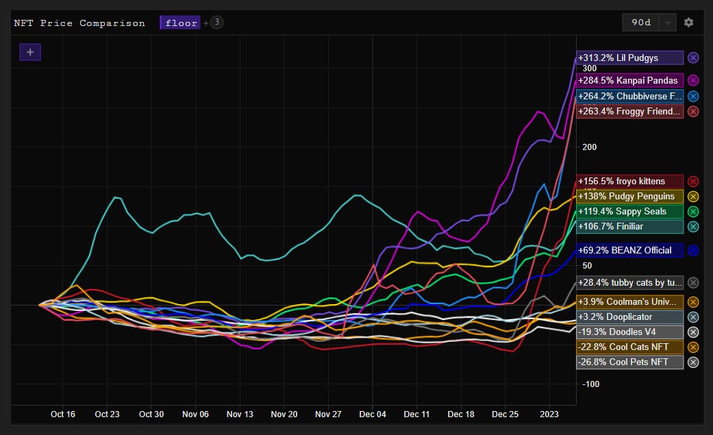 Zooming in some, the biggest cute-cap gainers over the past three months have been Lil Pudgys, Kainpai Pandas, Chubbiverse Friends, and Froggy Friends, all of which have seen their floor prices climb by more than 260% in that span.