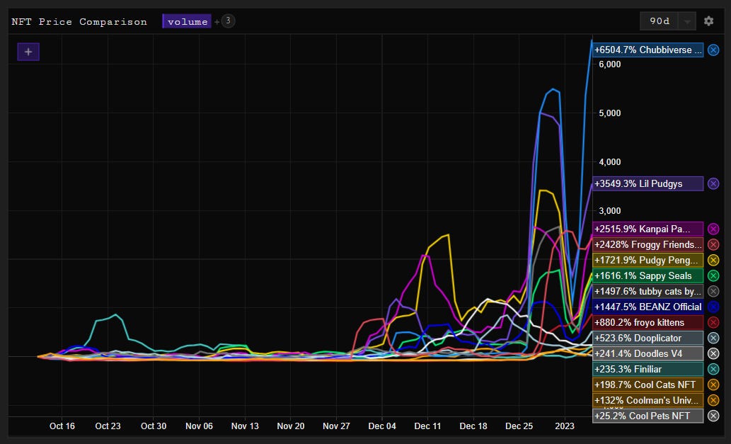 As for other big 90D climbers, Chubbiverse Friends (+264%) and Froggy Friends (+263%) have also seen their floors ramp up, yet not too far behind these collections have been other cuteness heavy hitters like Froyo Kittens (+157%), Pudgy Penguins (+138%), Sappy Seals (+119%), and Finiliar (+107%).