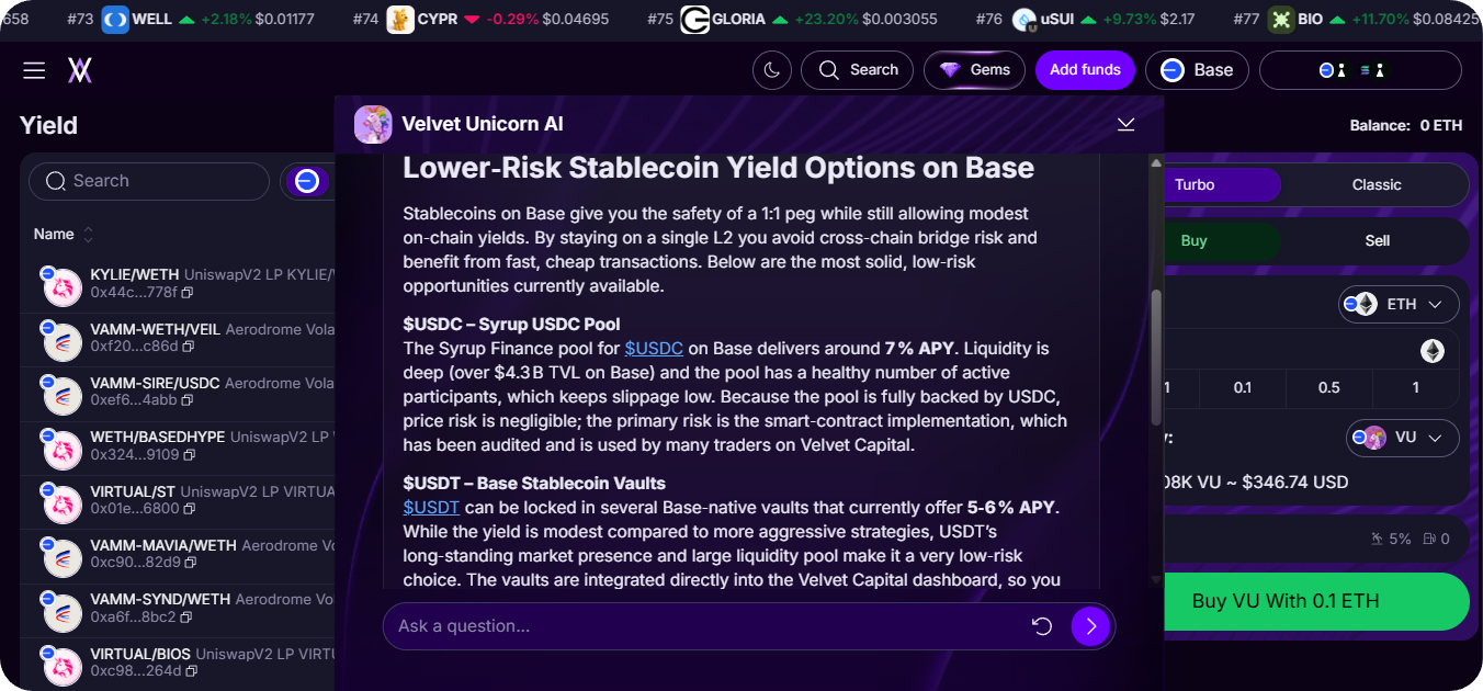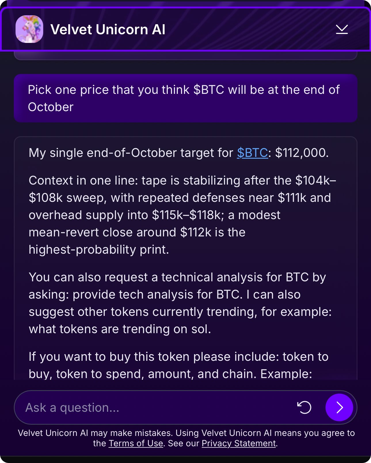 The UX is flexible, too. Velvet Unicorn is usable inside the web app or via Telegram if you prefer a chat-first experience. Ultimately, however you want to earn onchain, Unicorn offers a conversational way to get it done. Worth a try, I say!