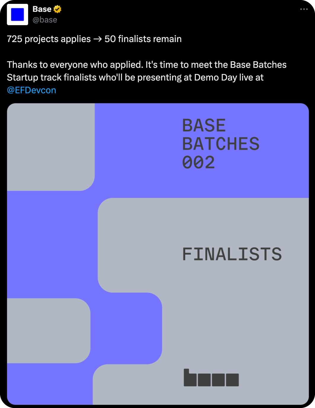 For context, Base Batches is Base's accelerator-esque program for teams building across two tracks: the Builder track for pre-product teams and the Startup track for teams with live products. The program's been running since early September and is now rapidly approaching its finale on Nov 19th, where Startup track finalists will demo in front of angel investors, VCs, and accelerators for the chance to receive funding and ecosystem support.