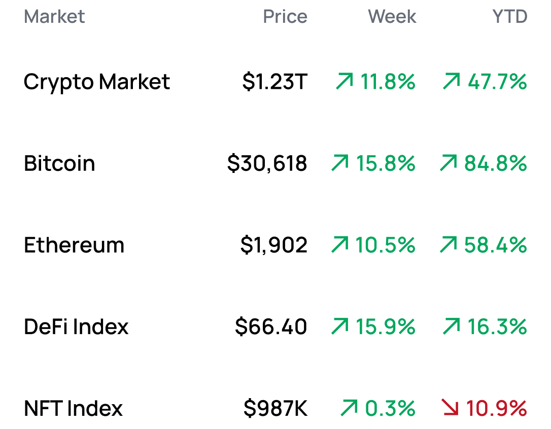 That largest crypto asset has rallied 15.2% over this period, hitting a 2023 high of more than $31,185 before retracing to its current price of around $30,500.