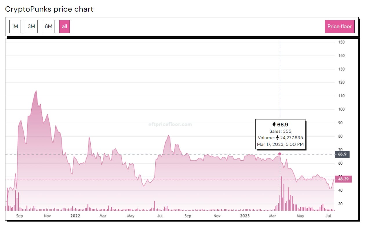 Of course, we are in a crypto bear market, and attention and activity levels are down bigly across the board. If interest’s down, prices go down. If confidence’s down, prices go down. For example, many people have dumped from their collections as morale and narratives have sunk, like the recent deflation of Azuki’s reputation after its controversial $40 million Elementals mint.