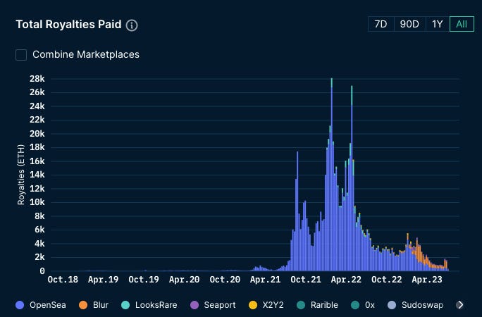 Talk to most non-technical creatives who’ve arrived in the space over the past few years, and automated royalty payments on secondary sales were a huge draw for many if not, well, all of them. It’s one of non-skeuomorphic “only possible with NFTs” things that’s lost its magic now that its power’s been pierced.