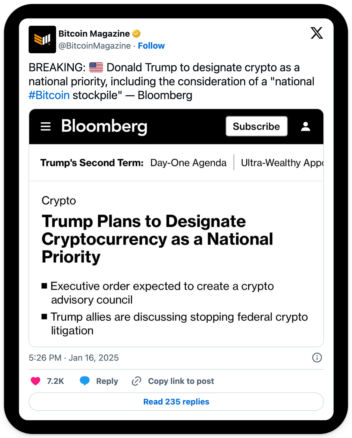 With the inauguration around the corner, Trump's talk has ramped up, with many announcements coming this week, even including hints at making digital assets a national priority.