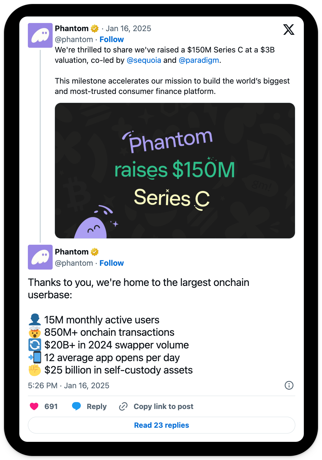 Since launching in 2021, Phantom has grown to host 15M monthly active users and $25B in self-custody assets. In their new funding announcement, the Phantom team said that in November and December 2024, their wallet had surpassed