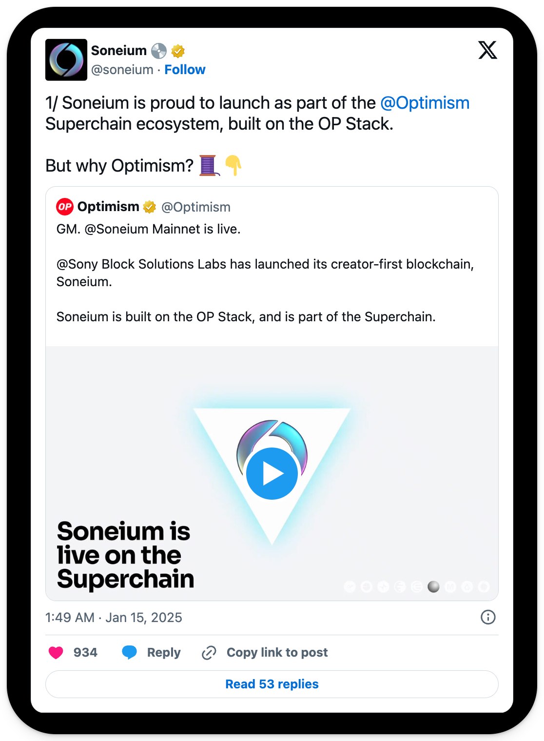 5️⃣ Sony’s L2 Sonieum Goes to Mainnet on OP Stack