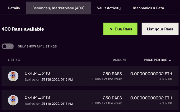 To buy or sell Raes, you’d simply head to your Vault page of choice and select either from the “Buy Raes” or “List Your Raes” options. You can also click on the “Secondary Marketplace” tab to review above-floor Rae listings.