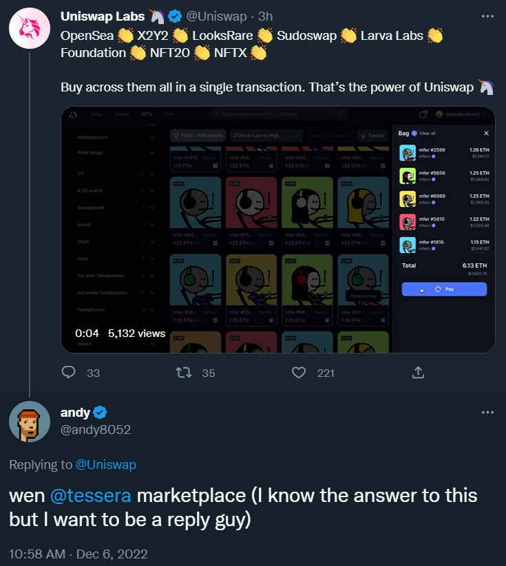 Additionally, look for other NFT projects to start plugging into Tessera’s open infra. For example, Tessera co-founder Andy Chorlian just teased that Uniswap’s NFT aggregator system is poised to plug into Tessera Marketplace soon.
