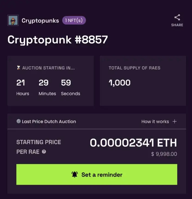 While the initial auction for Punk #4847’s 1,000 Raes are over, the zero-fee Tessera Marketplace is now live and makes it possible to buy or sell these Raes, and future sold-out releases, via secondary sales. Punk #4847’s Raes were trading around 0.09Ξ each at the time of this post’s writing.