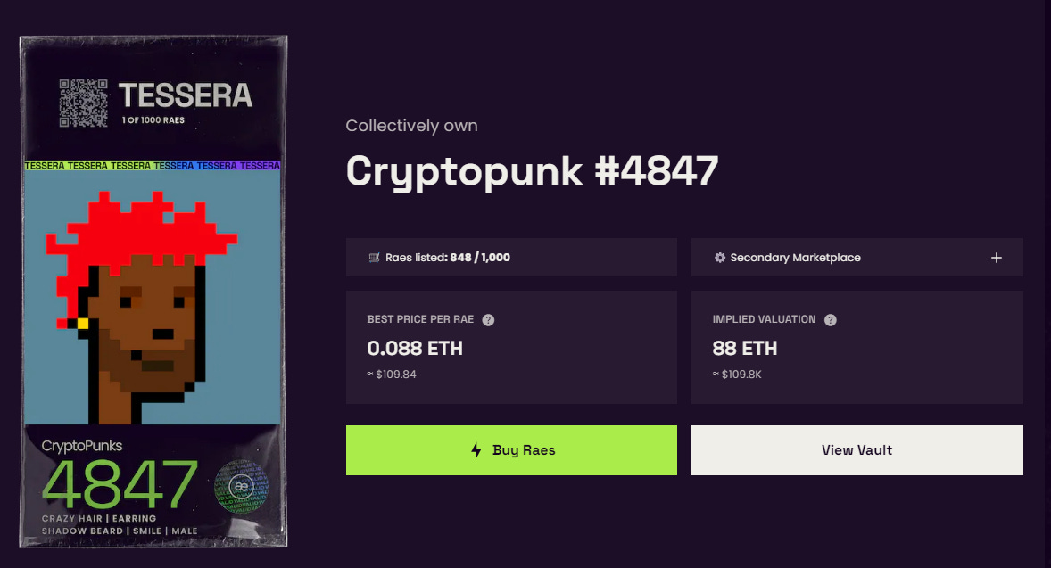 If you want to take a peek at the new Tessera rollouts, head to tessera.co and sign in with your Ethereum Ethereum wallet. The homepage will feature the project’s curated NFT Vaults, the first of which is for CryptoPunk #4847.