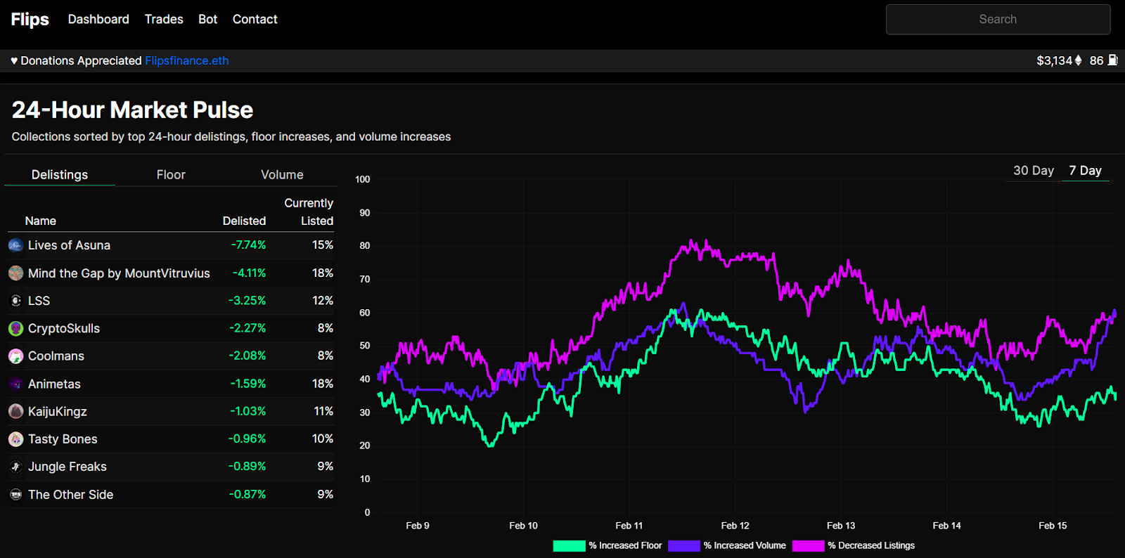 • Flips — An NFT analytics hub that specializes in tracking delistings, floor increases, and volume increases.