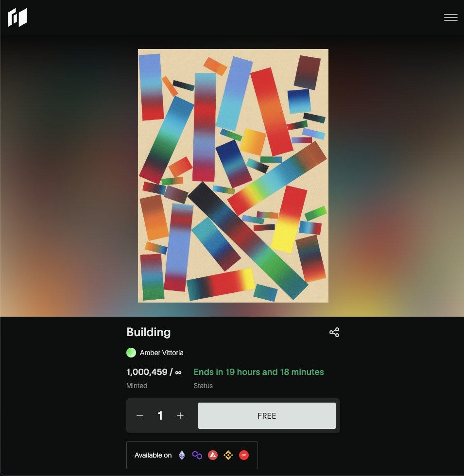 Summary: An open edition released by artist Amber Vittoria in collaboration with Holograph, a multichain NFT protocol. 10 mintable at a time. It’s an accessible and lovely entry to the world of multichain NFTs, but if you want in you better act fast because the drop window’s almost over!