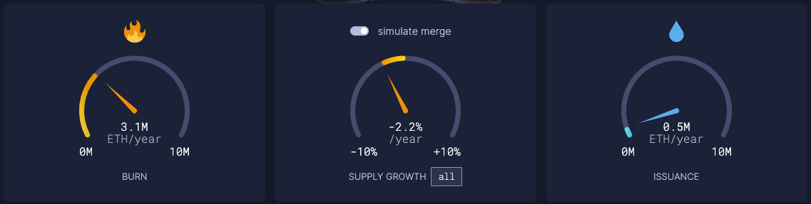The network is on track to burn 3.1M ETH per year (remember that transaction fees won’t go down with The Merge!) and is projected to issue less than 1M ETH per year, depending on the amount of ETH staked.