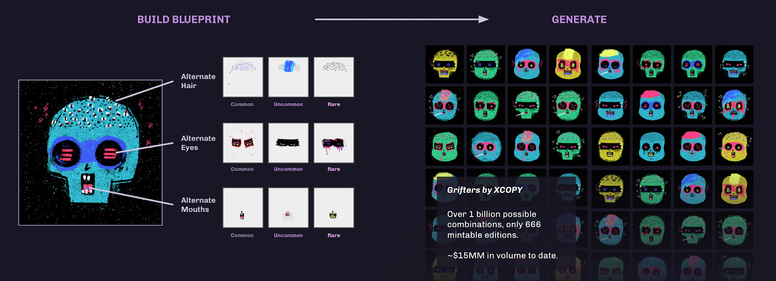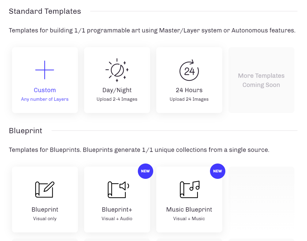 🎶 Music Blueprint — Custom-tailored for musicians, this is a no-code music template system where audio layers can be uploaded and then used to create generative editions by collectors.
