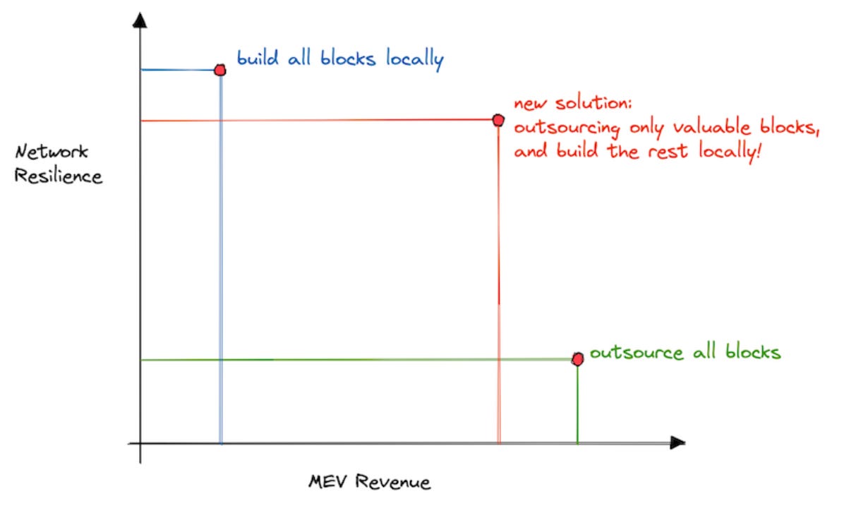 The latest solution at Flashbots offers a middle ground solution for this dilemma by letting validators set a minimum bid for outsourcing block building. This works because most blocks have low MEV profits. Validators committed to this strategy would leave a small amount of block-building MEV profits on the table, still acquire the mammoth share of MEV profits and vastly improve Ethereum’s censorship-resistance.