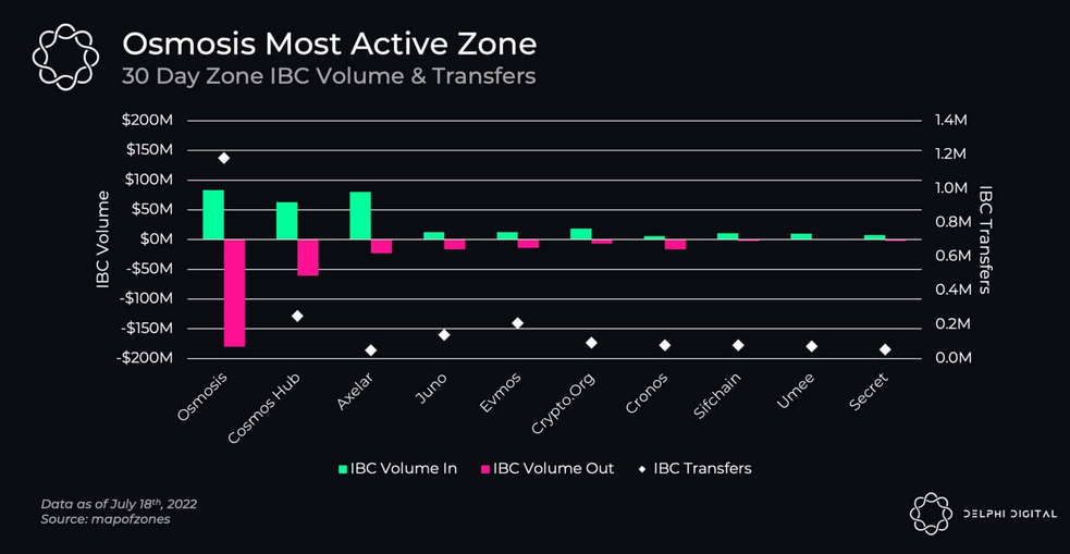 The main draw for building in Cosmos is a level of flexible modularity that isn’t possible on other smart-contract chains. It’s also much easier to build a blockchain from scratch on the Cosmos IBC thanks to its SDK and Tendermint consensus engine. Testament to its successful model are a range of up to 49 active Cosmos IBC chains, most notably Osmosis, ̶T̶e̶r̶r̶a̶, Cronos, Evmos, Kava, and many more, including dYdX’s decision to migrate from Ethereum to Cosmos (I’ve written on dYdX’s departure from Ethereum here).