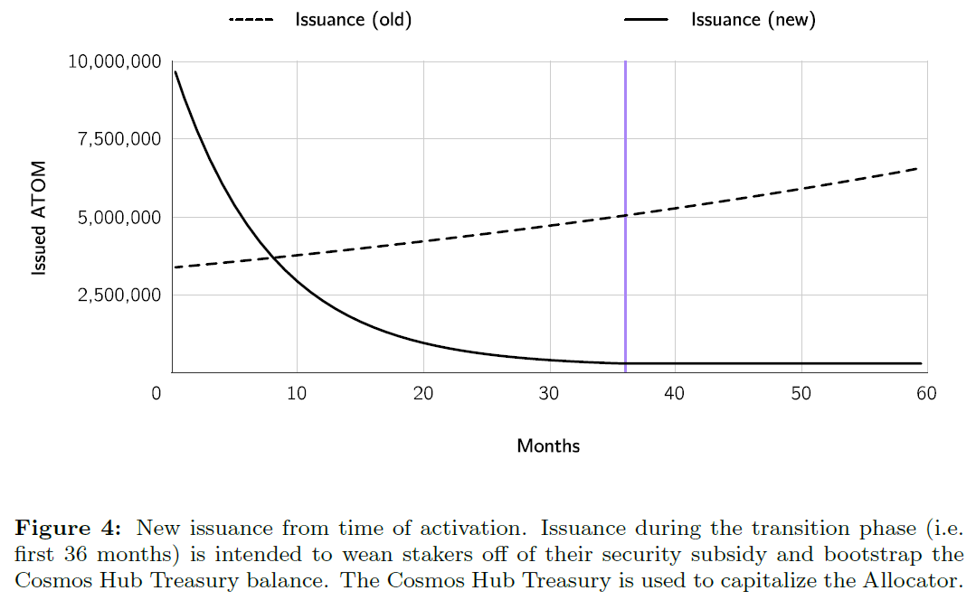 - The second is liquid staking, which enables the rehypothecation of staked ATOM tokens across Cosmos IBC, something ATOM stakers on the Cosmos Hub currently lack. ATOM’s current monetary policy is similar to pre-Merge ETH; it dynamically adjusts based on demand and supply of staking. ATOM inflation increases when staking is low, and decreases when staking is high. This will change into a deflationary direction over 36 months.