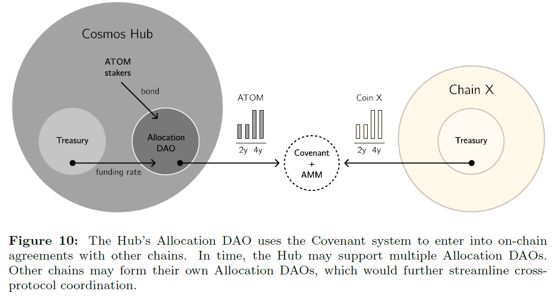 - The fourth is the Interchain Allocator, which is an unnecessarily technical way to say that Cosmos Hub’s treasury funds will be used to invest and fund new Cosmos chains through on-chain agreements. Stakers can lock up their ATOM in DAOs, granting them voting power over the DAO and be rewarded by Cosmos Hub funding if these DAOs succeed. The basic idea here is that Cosmos Hub will be a Big Player aligning incentives between ATOM holders and DAOs to create public goods, akin to Gitcoin in the Ethereum ecosystem.