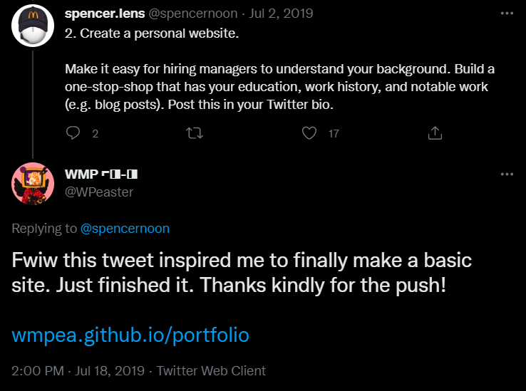 I’ve used that site, wmpea.github.io/portfolio, as my portfolio ever since, and it’s led to more than a few awesome work opportunities in its time. I definitely recommend creating a portfolio website with your basic background info. How you ultimately do so is up to you. I created and still maintain mine for free through GitHub Pages, so if that route’s of any interest to you, I recommend checking out this helpful Quickstart for GitHub Pages guide.