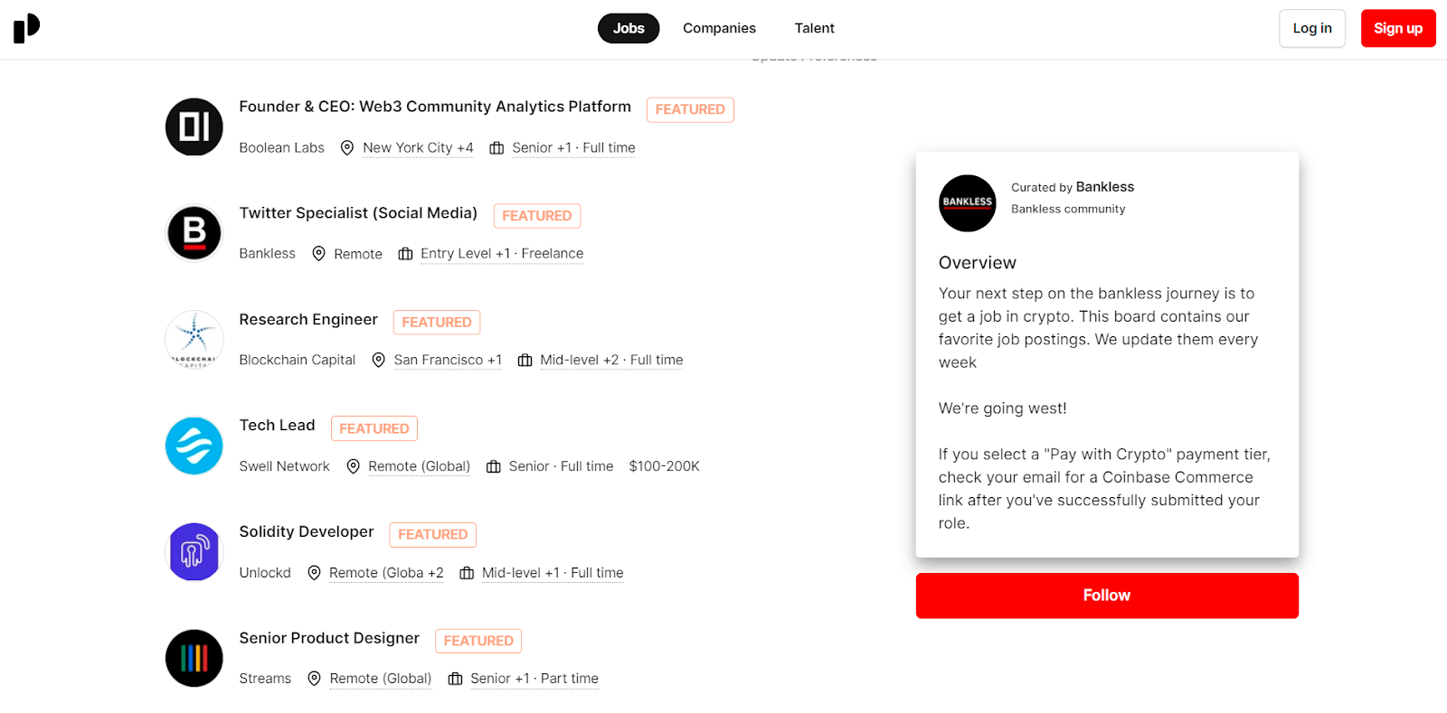 Bankless runs a Pallet jobs board where you can find and apply to some of the ecosystem’s best job opportunities at any given time.