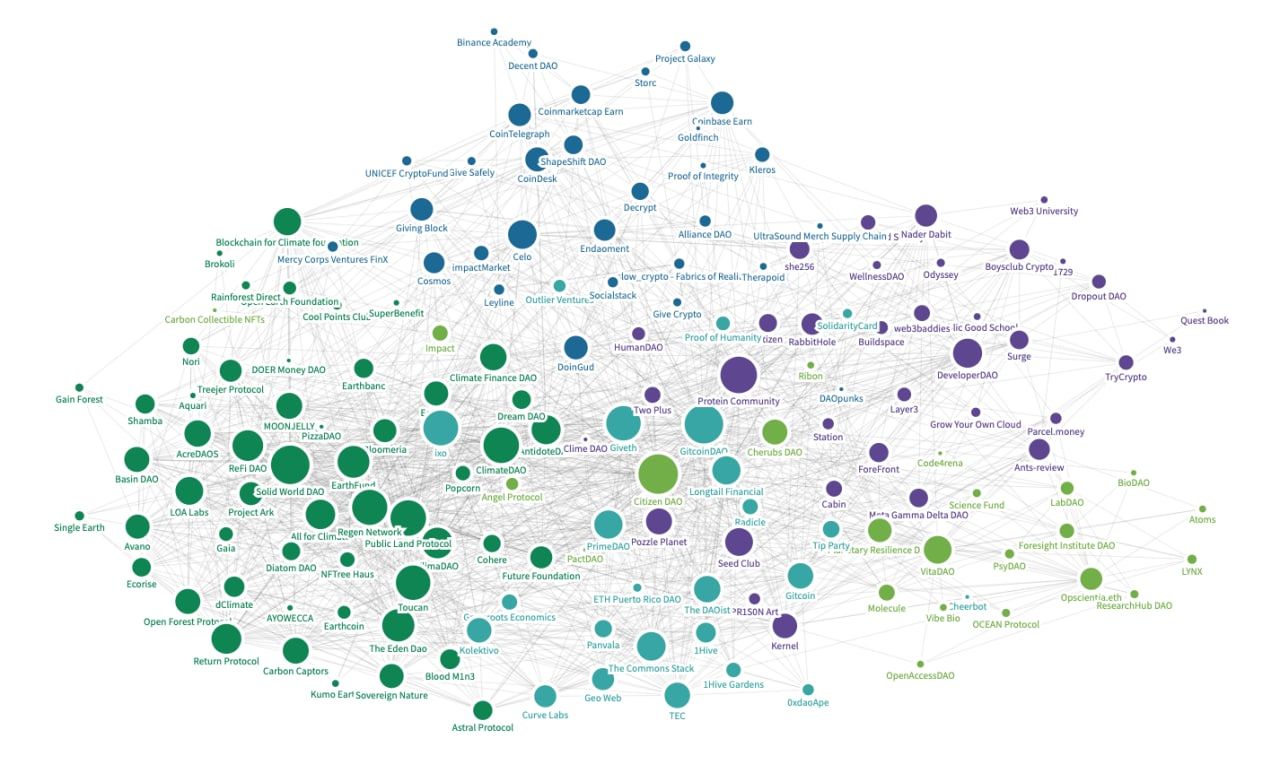 Once we assembled a database of these projects, the next step was to find opportunities for cross-pollination of intellectual/economic/human resources between them. Here is a map of how they all relate to each other on Twitter. Each dot is an ImpactDAO, and each edge is a follower that is shared between two ImpactDAOs: