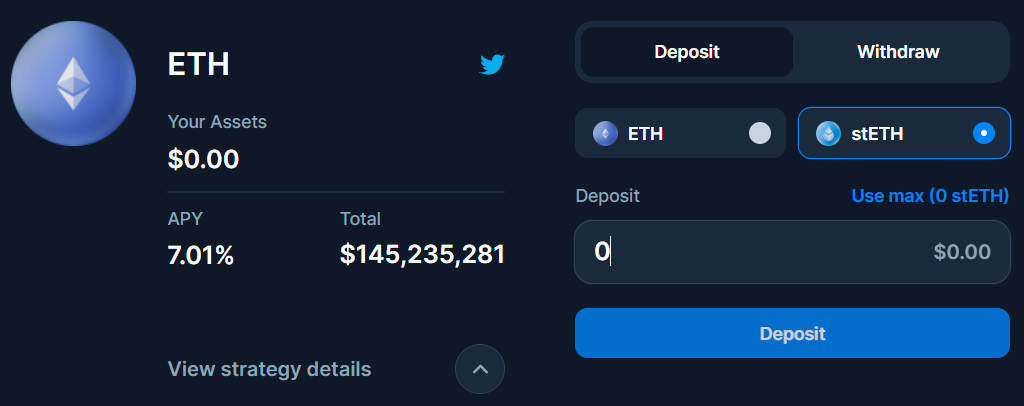 - Input how much ETH or stETH you want to deposit and press “Deposit.”