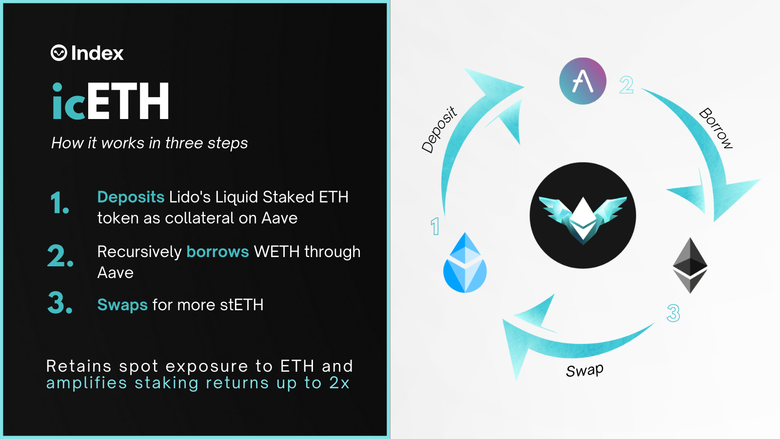 Lido Staked ETH (stETH) to Aave and then borrowing against the collateral to buy more stETH, over and over again as needed. The on-chain maneuvering allows icETH to amplify staking yields by up to 2x and sometimes more!