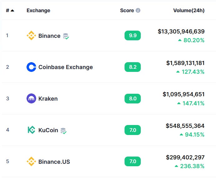 Over the past day, Binance’s volumes were nearly 9x higher than its closest competitor, Coinbase.