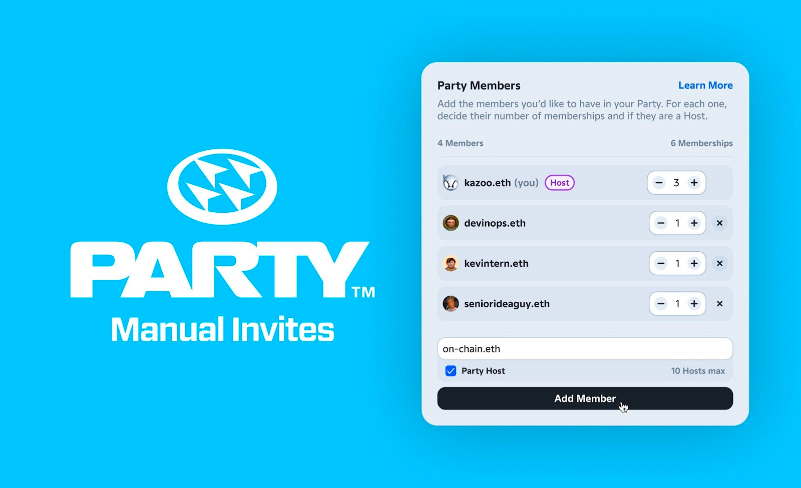 Want a swift way to kickstart a group wallet with your friends? Party's new feature, Manual Party Invites, can be your new go-to. Instead of crowdfunding, simply select your squad members using their ENS name or Ethereum address. Customize voting power, add your art, and voilà, instant NFT memberships airdropped to your group. Dive in deeper with features like delegation, ERC20 + NFT trading, email alerts, and more. Perfect for those looking to form their onchain crew without needing to crowdfund first.