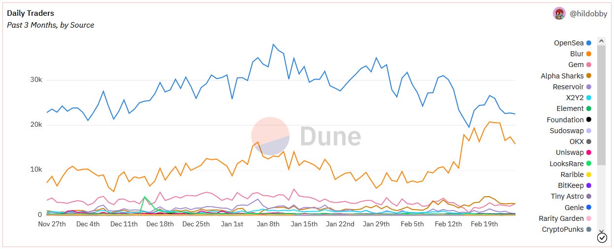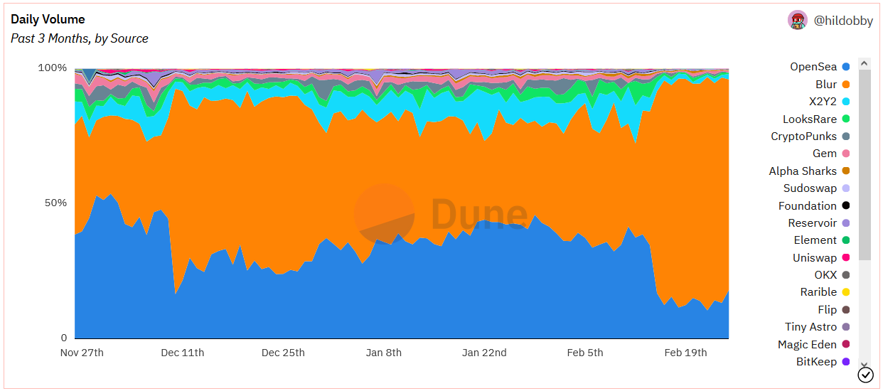 Following a successful airdrop, Blur is not falling by the wayside like other trendy NFT marketplace platforms have. In fact, this past week has seen Blur consistently flipping OpenSea in trading volumes.
