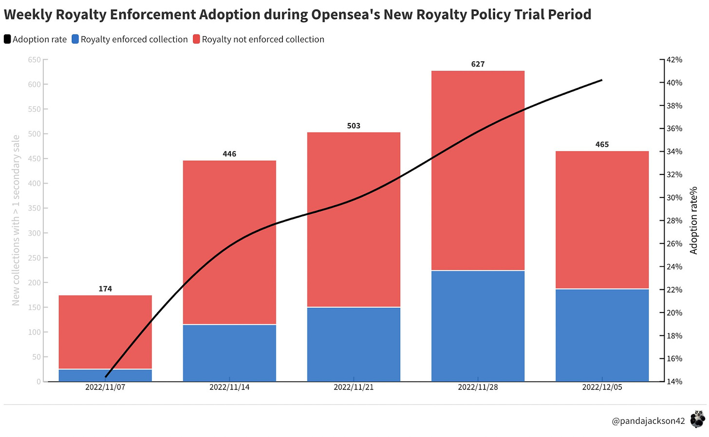 The platform introduced a “pro-creator” policy on November 8th that forced creators into the dilemma of choosing between earning royalties on OpenSea or Blur. OpenSea declared that it would restrict creator royalties on their marketplace, unless creators voluntarily blocked zero-royalty marketplaces (including Looksrare, X2Y2 and Sudoswap) from trading their collections in their smart contract code.