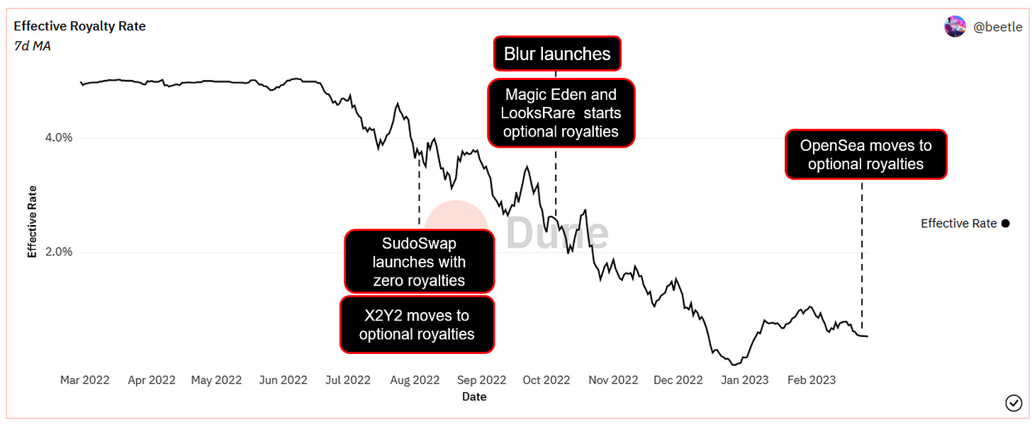 After the bull died down, illiquid market conditions set the stage for emerging NFT marketplaces like Sudoswap and Magic Eden to test market waters with zero royalty policies. Blur’s ascent in recent months single-handedly accelerated the abandonment of the market standard of NFT royalties being honored.