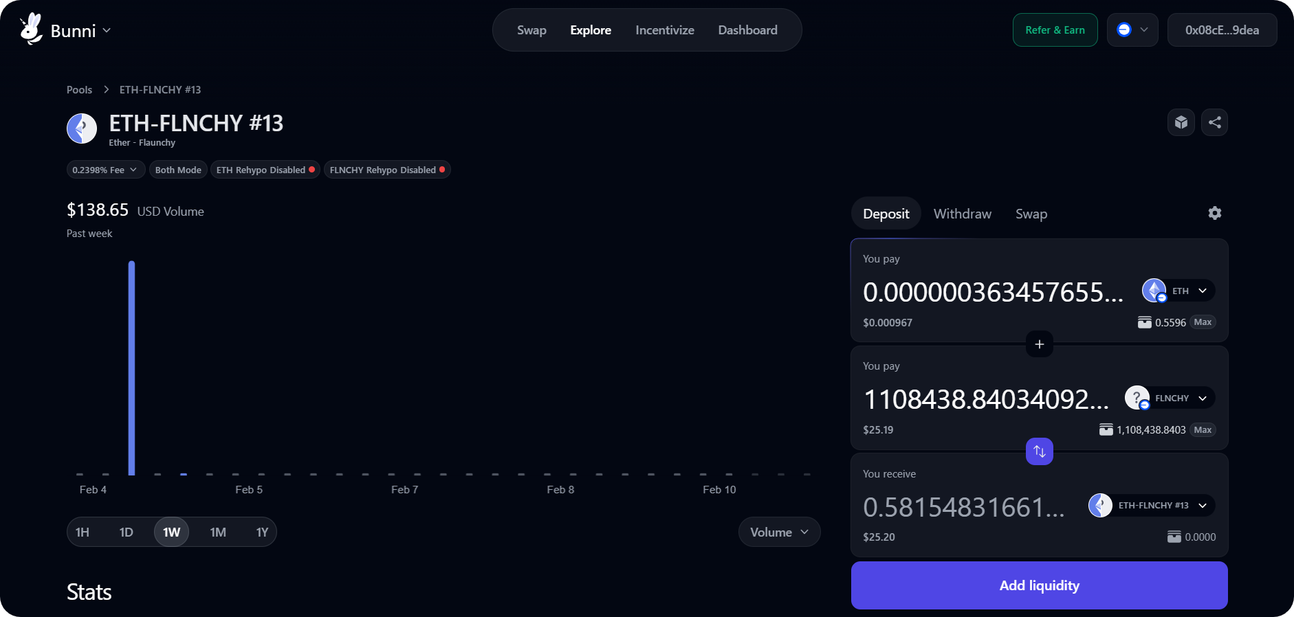 - To finish up, press "Deposit" and sign the final transaction prompts with your wallet — now you'll be providing liquidity on Bunni