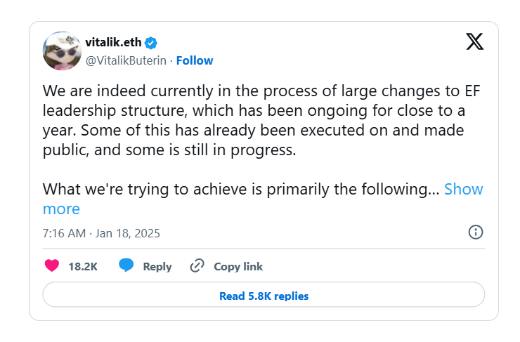 Indeed, in a recent tweet, Vitalik noted that the EF was "in the process of large changes," including improving "communications and ties between EF leadership and ... ecosystem actors, old and new, that it is our role to support."