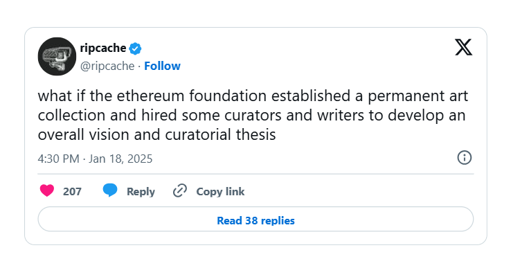 I'm biased as an NFT wonk, but I did come across what I think is an awesome suggestion by the artist ripcache, who floated the idea of the EF establishing a permanent collection of Ethereum-based art.