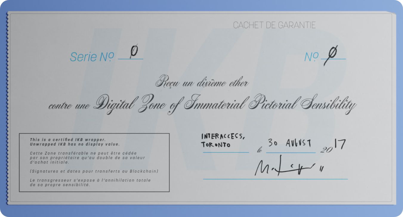 Minted in 2017 before the ERC-721 NFT standard existed, this series is a reimagination of Yves Klein’s Zones de Sensibilité Picturale Immatérielle (1958) atop Ethereum.