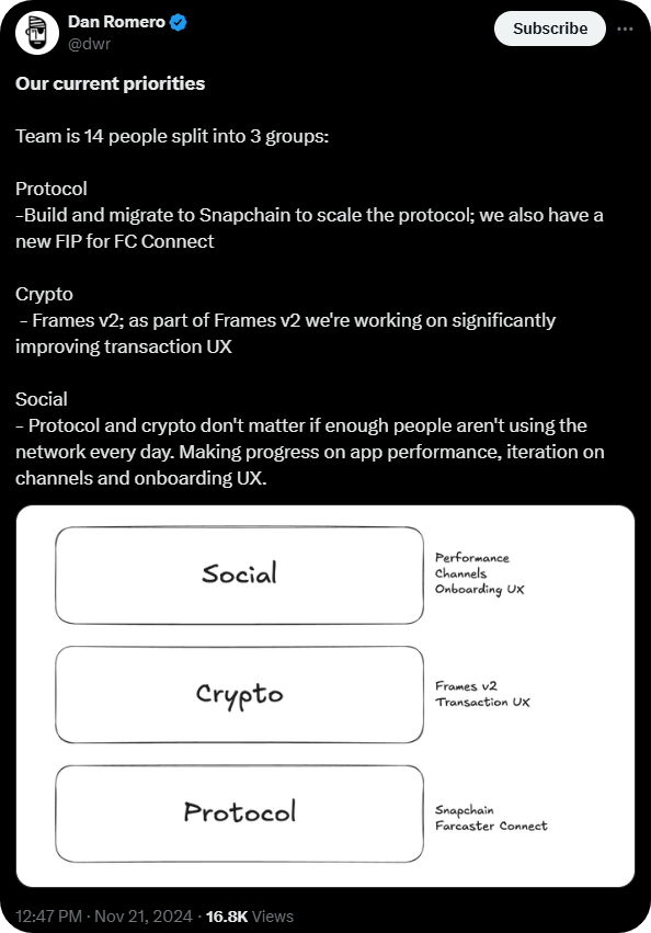 This week, Farcaster founder Dan Romero laid out the onchain social network's current priorities in a short tweet.