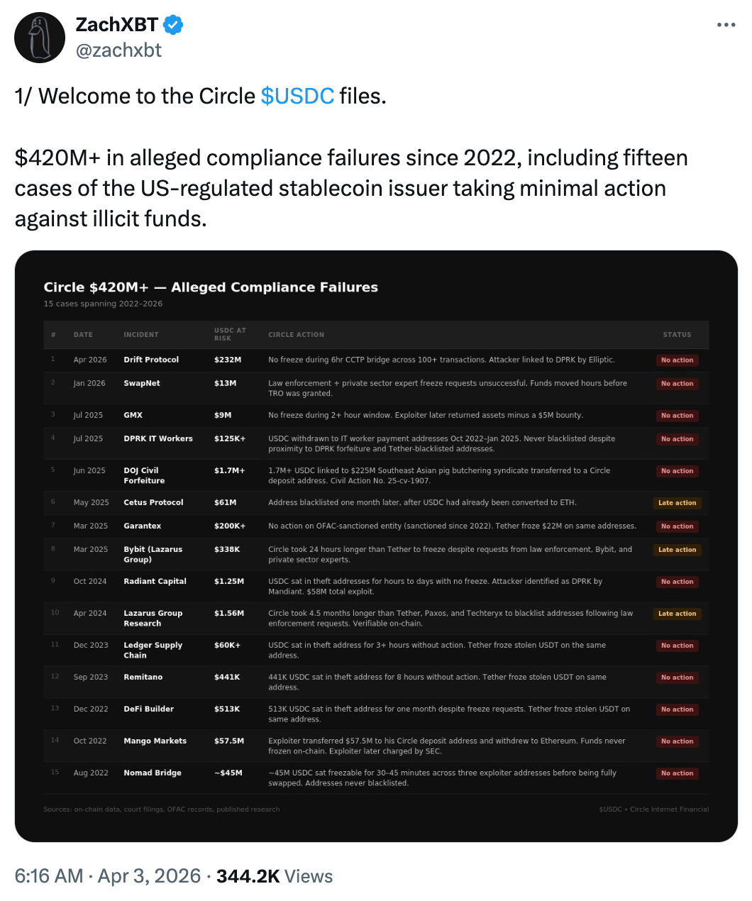 - Drift Disaster: In a recent exploit condunducted earlier this week, attackers successfully bridged $280M of stolen Drift funds through Circle's CCTP infrastructure, casing out their ill-gotten gains over the course of multiple hours amid public cries for intervention.