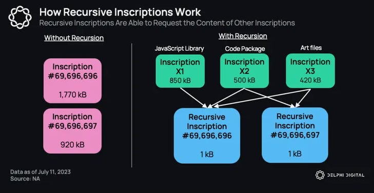 This method has also notably paved the way for composability and dynamism in Bitcoin NFTs, as recursive inscriptions work well for things like sharing resources (openly usable audio, code, images, etc. on Bitcoin) and content remixing (modifying existing inscriptions on Bitcoin).