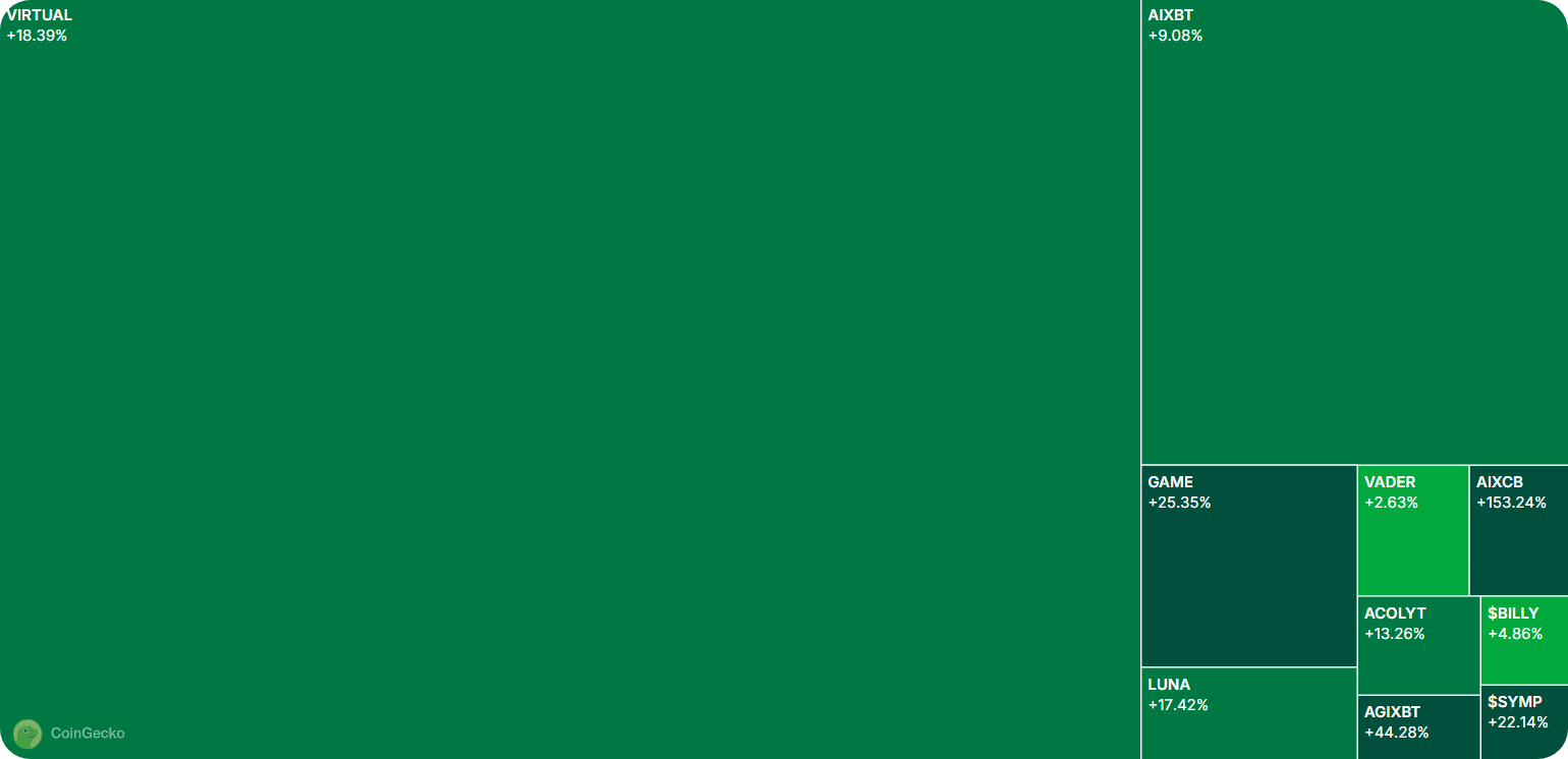 While all still down on the week (like the overall agent market cap), tokens like $VIRTUAL shot up ~18% today, while $GAME climbed ~20% and $AIXBT rose ~10% in that span.