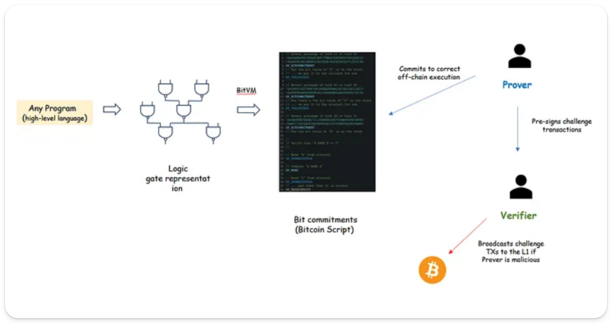 BitVM's approach involves off-chain execution of transactions with the functionality to verify them onchain within the challenge window through fraud proofs, a mechanism akin to Ethereum's optimistic rollups.