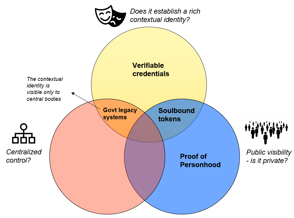 In short, these projects are useful in establishing personhood, but that individuality is a black box. They are not geared towards the mapping of rich, contextual identities on a social graph and how people relate to one another like soulbound tokens and verifiable credentials try to do.