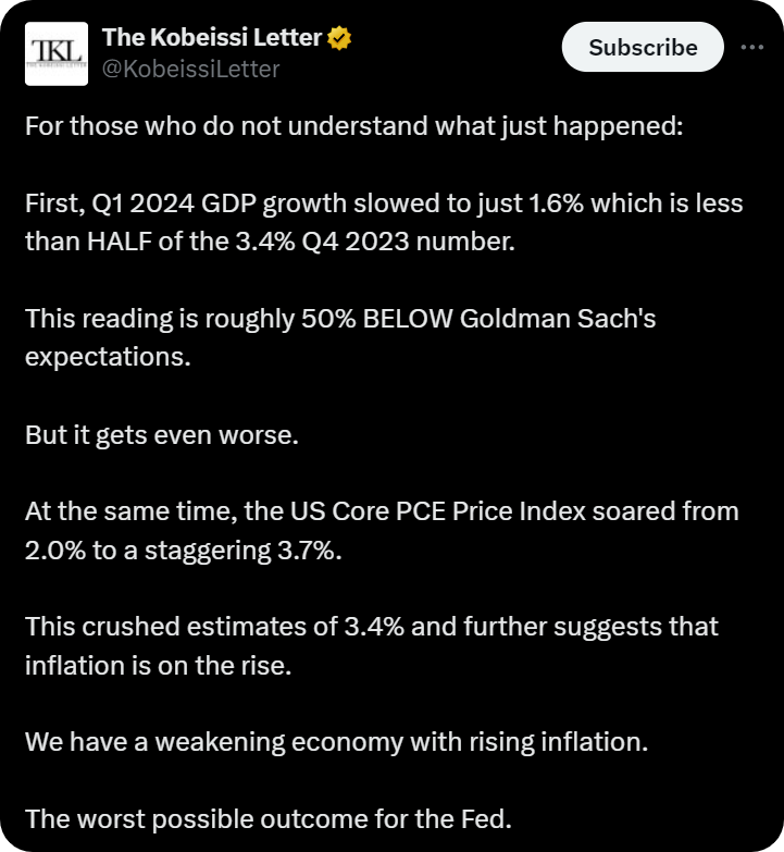 Simultaneously, the personal consumption expenditures (PCE) price index, a key inflation variable, came in at an annualized rate of 3.4% for Q1, beating expectations of 3.4% and soaring from the 2.0% reading last quarter.