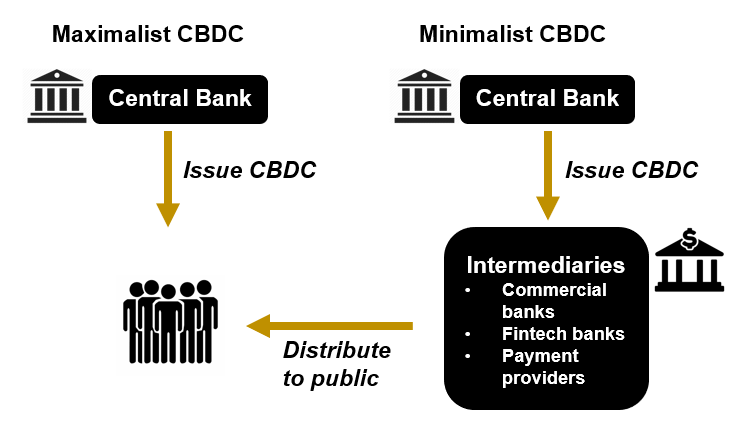 A maximalist CBDC is issued directly to the public within deposit accounts that are managed by the central bank. A minimalist CBDC is issued to selected private sector intermediaries, which then distribute it to the public.